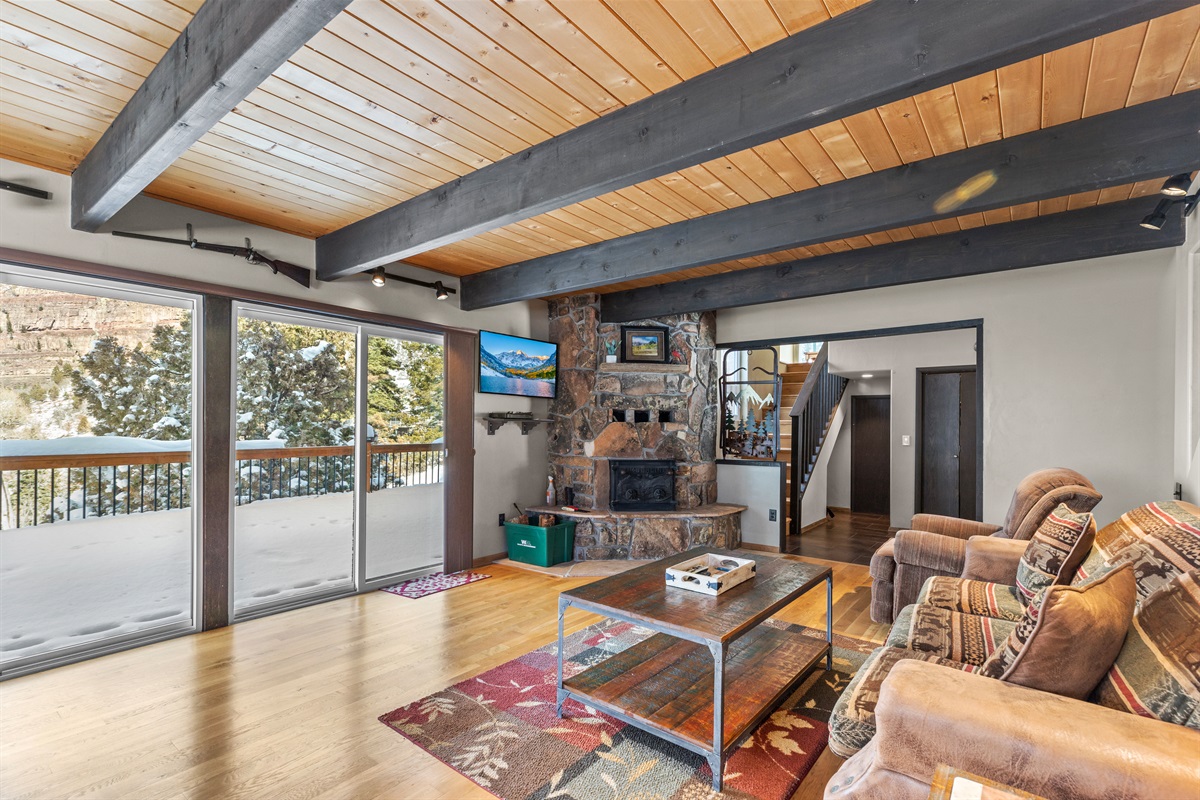 • Main living room with large windows, mountain views, and deck access